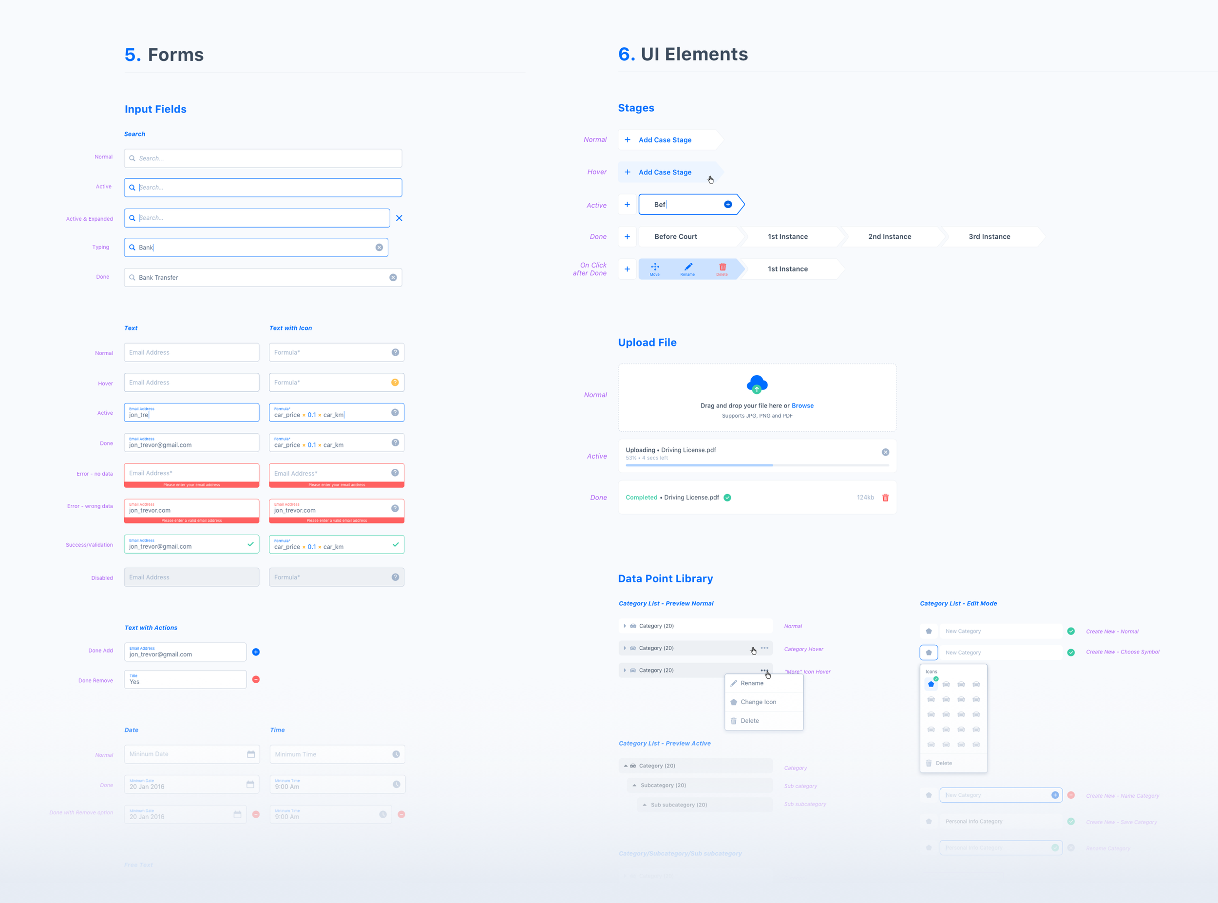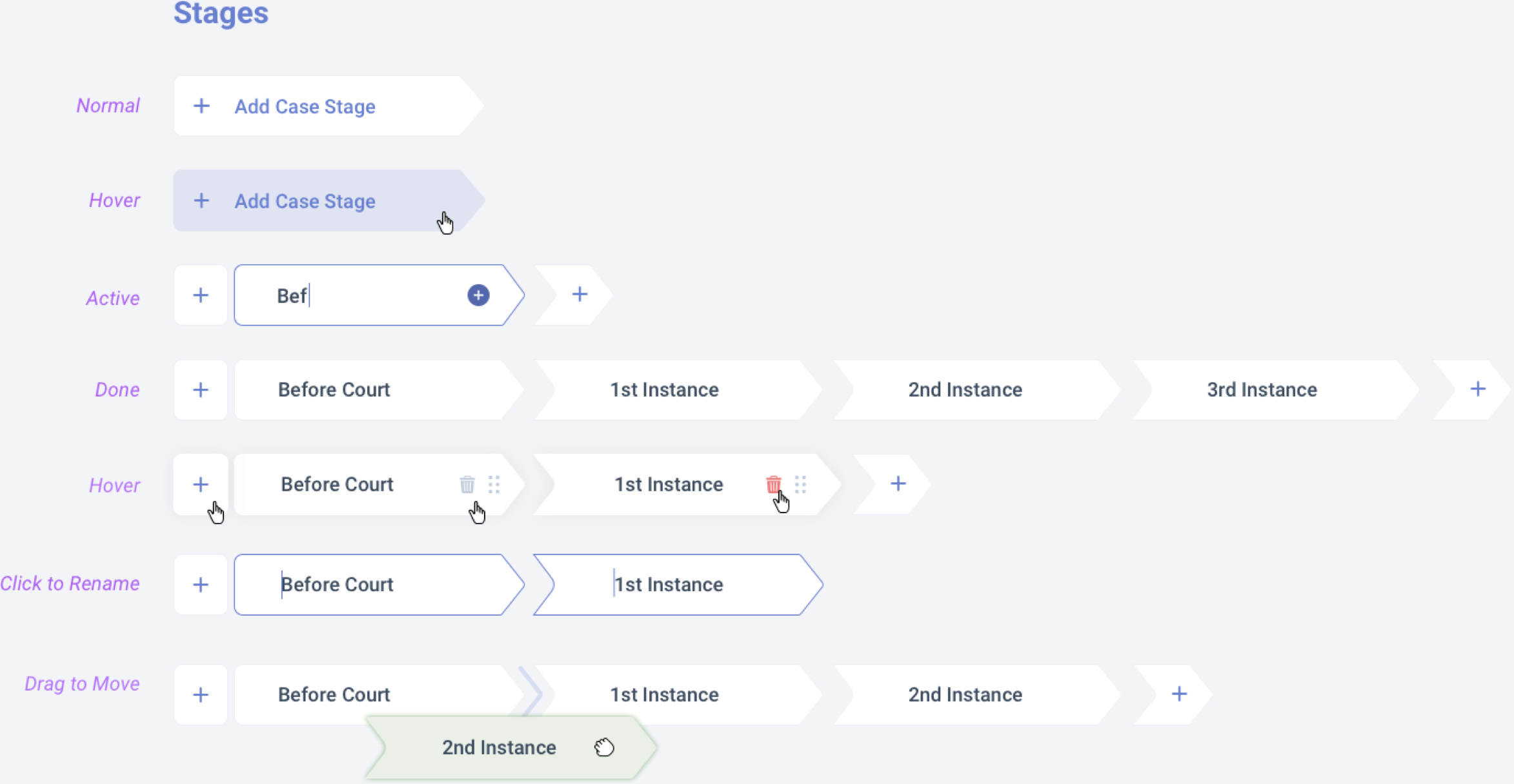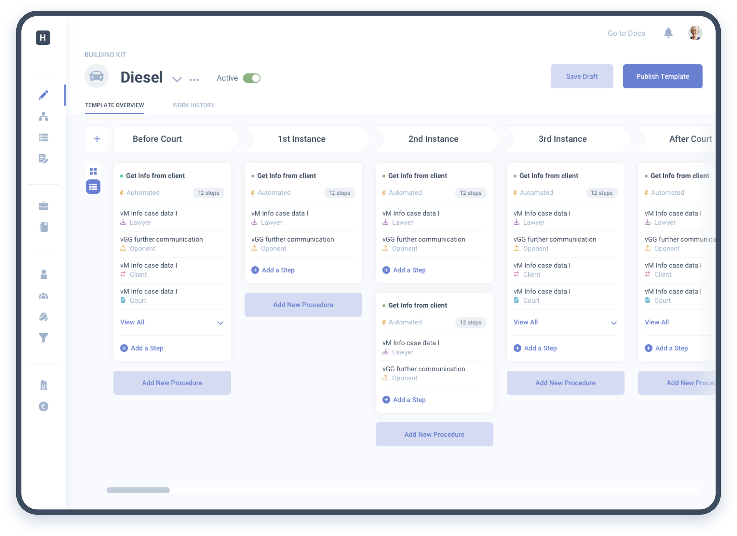 The solution here for me was pretty straightforward, I wanted to offer the law architects a way of seeing the whole case from the top with a big perspective, in a glance, like a Trello board. So a step-by-step structure, timeline-like, was created, where all the components were draggable and the editing couldn't be easier.