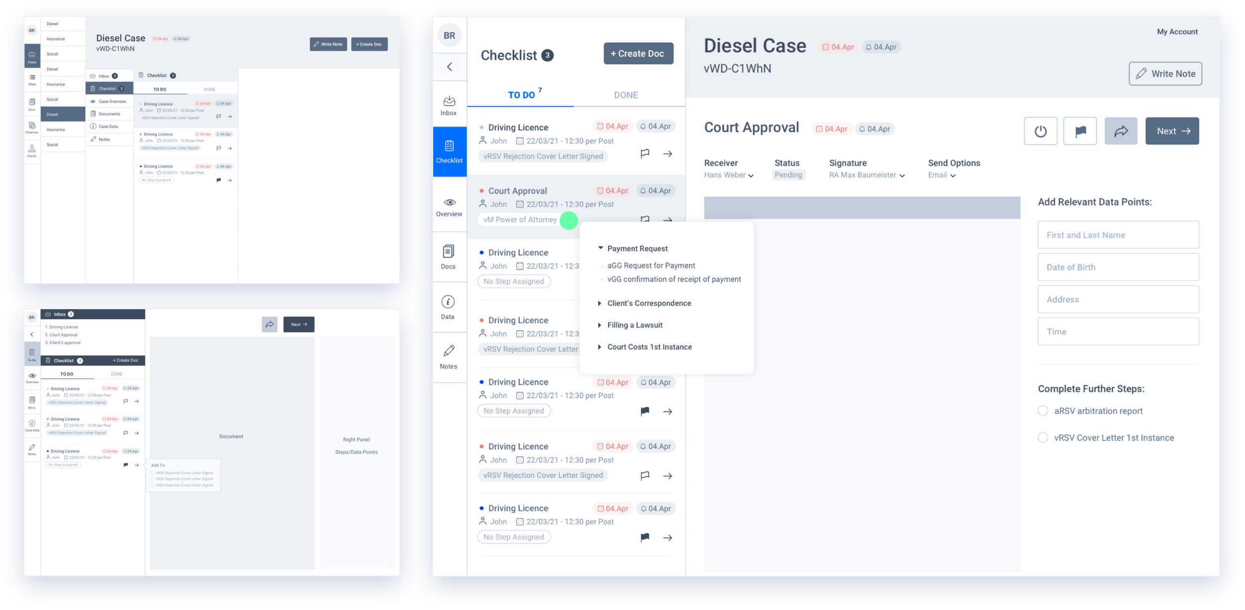 There were 2 digital products working in parallel, the backend, used by the law architects, to create the law case template. And the frontend, which was used by the lawyers, to manage all the incoming and outgoing documents for each law case they are working on.