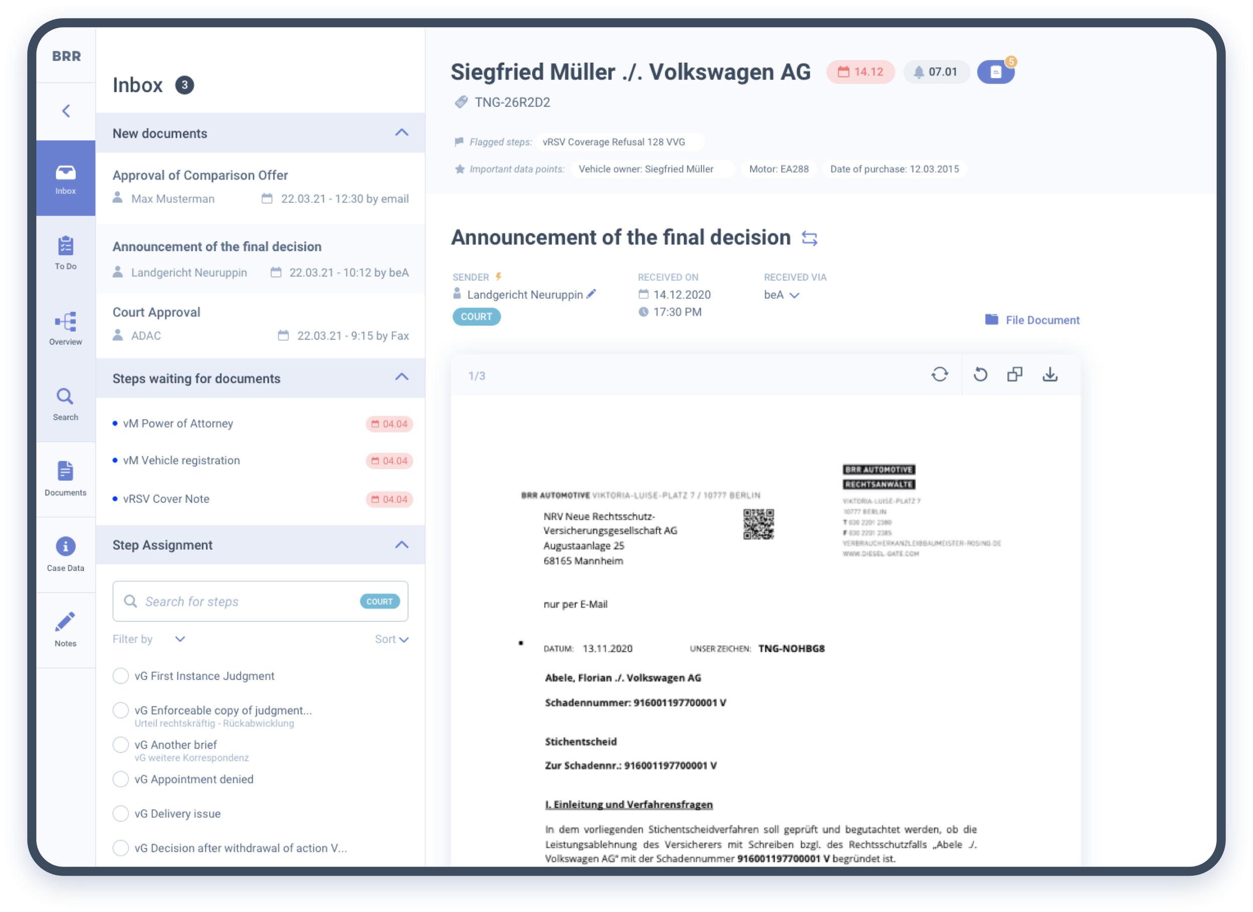 Since the lawyer's work was very much around receiving new documents every day and assigning them to a specific case, I changed the existing layout of a table with multiple filters making the screening process quite exhausting, to an inbox-like template.